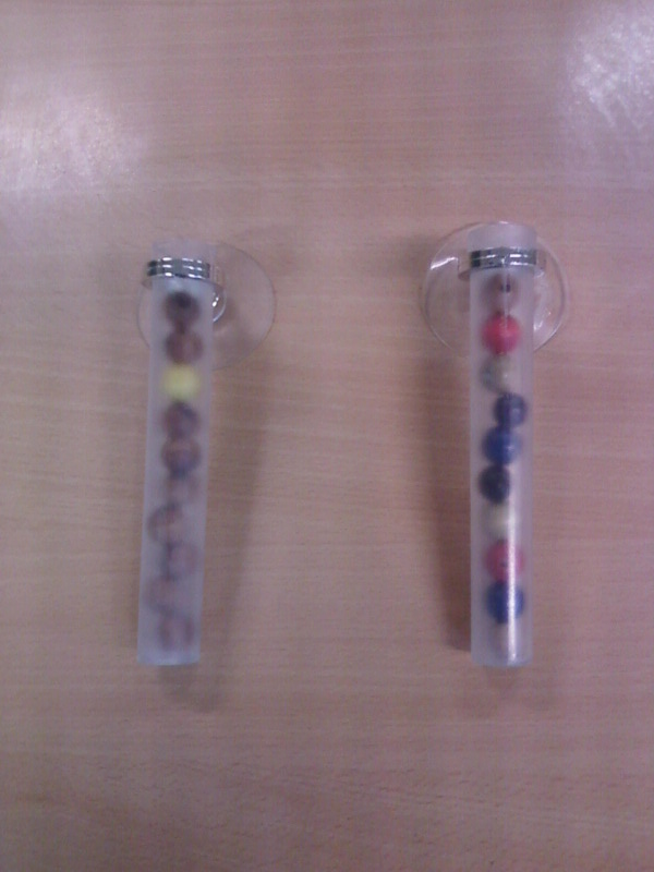 Daher sind wir seit diesem Schuljahr auf Reagenzgläser mit Ständer umgestiegen. Diese gab es sogar als Deko-Ware in bunt, was noch viel schöner aussieht. Jetzt brauchen wir nicht mehr über den Boden krabbeln, unter Schränken suchen und rätseln, wie viele Kugeln noch mal in welchem Glas waren. Außerdem haben sie den Vorteil, dass sie portabel sind und sogar in andere Räume mitgenommen werden können.