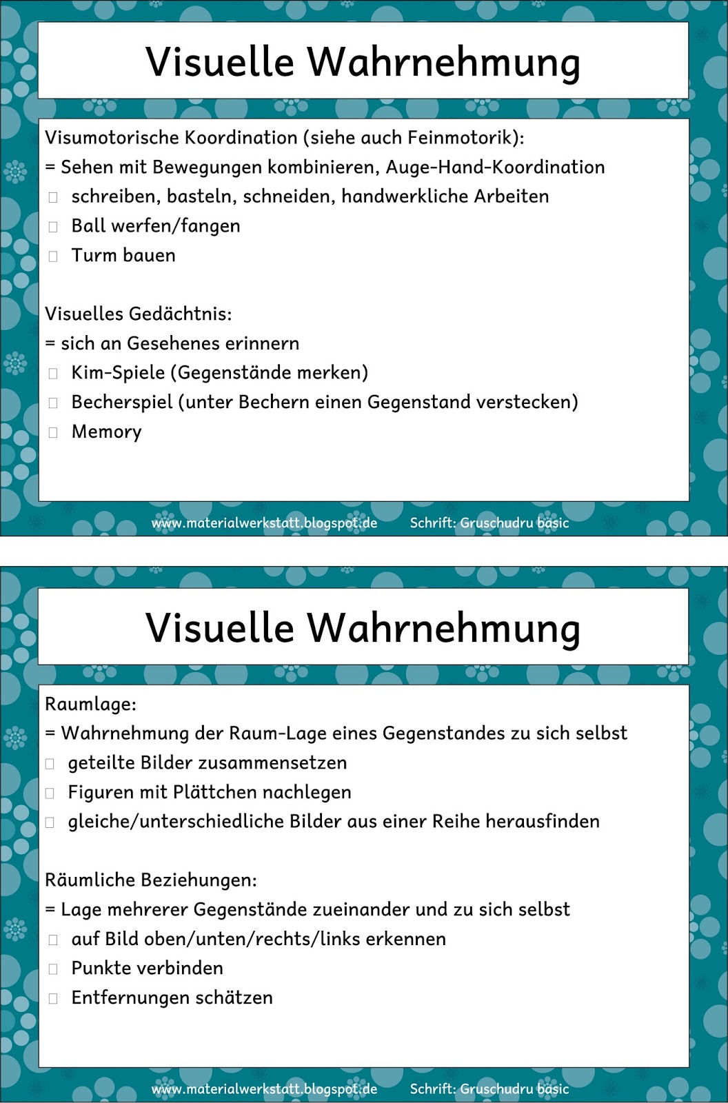 HAllo,ich habe vor Jahren auch angefangen mir eine kleine Kartei anzulegen, bin aber immer noch nicht fertig. Je nach Schüler und Gutachtensituation muss ich sie ergänzen oder ändern.Allerdigs habe ich eine andere Unterteilung der Kategorien. Ich habe Grob nach Motorischer Entwicklung (Grob-/Feinmotorik), Visuelle Wahrnehmung (Visuomotorik, Figur-Grund-Wahrnehmung, Wahrnehmungskonstanz, Raum-Lage, Visuelles Gedächtnis), Auditive Wahrnehmung (Auditive Aufmerksamkeit, Auditive Diskriminationsfähigkeit, Auditive Analyse, Auditive Segmentation, Auditive Merkfähigkeit) Taktil-Kinästhetische Wahrnehmung, Mnestische Funktionen, Kognitionen, Sprache,Schulische Voraussetzungen (Lesen/Schreiben, Mathematik, Sach-Umweltwissen, Lern- Arbeitsverhalten, Sozial-emotionales Verhalten)Auch wenn die Visuomototik natürlich die Feinmototik beeinflusst und umgekehrt, fand ich es für mich sinnvoller das zu trennen. Bei entsprechenden Kindern, habe ich dann auf Zusammenhänge hingewiesen. Es gab aber auch Kinder, die nicht in der Lage waren die Lineatur einzuhalten, obwohl sie feinmotorisch super waren. Aber wie gesagt, ich tüftle weiter und bin froh immer wieder neue Anregungen zu finden. Danke dir dafür!