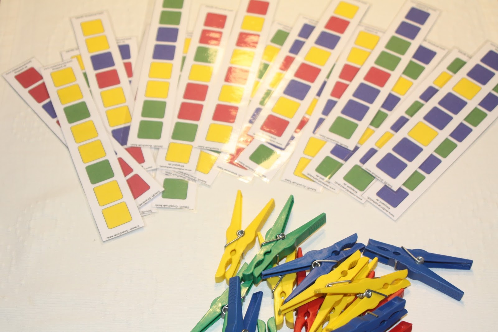 Bei diesen 21 Klammerkarten sollen Wäscheklammern entsprechend der Farben in der richtigen Reihenfolge angebracht werden. Es gibt Karten mit 2, 3 und 4 verschiedenen Farben und außerdem 7 Blankokarten für eigene Muster. Bei einigen Karten lässt sich die Farbreihenfolge auch fortsetzen, was auch mit den Blankokarten möglich wäre.
