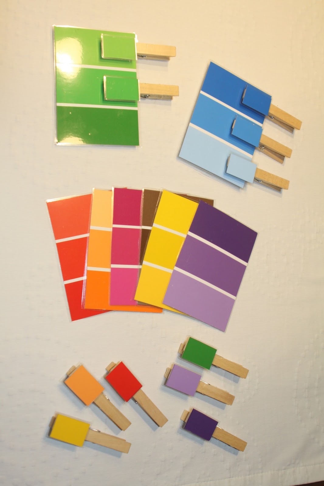 Hergestellt habe ich sie aus Farbkarten, die es im Baumarkt gibt. Dazu habe ich rechts und links die Beschriftung auf den Karten abgeschnitten und anschließend laminiert. Aus den abgeschnittenen Resten habe ich kleine Rechtecke geschnitten, laminiert und mit doppelseitigem Klebeband auf Wäscheklammern angebracht.