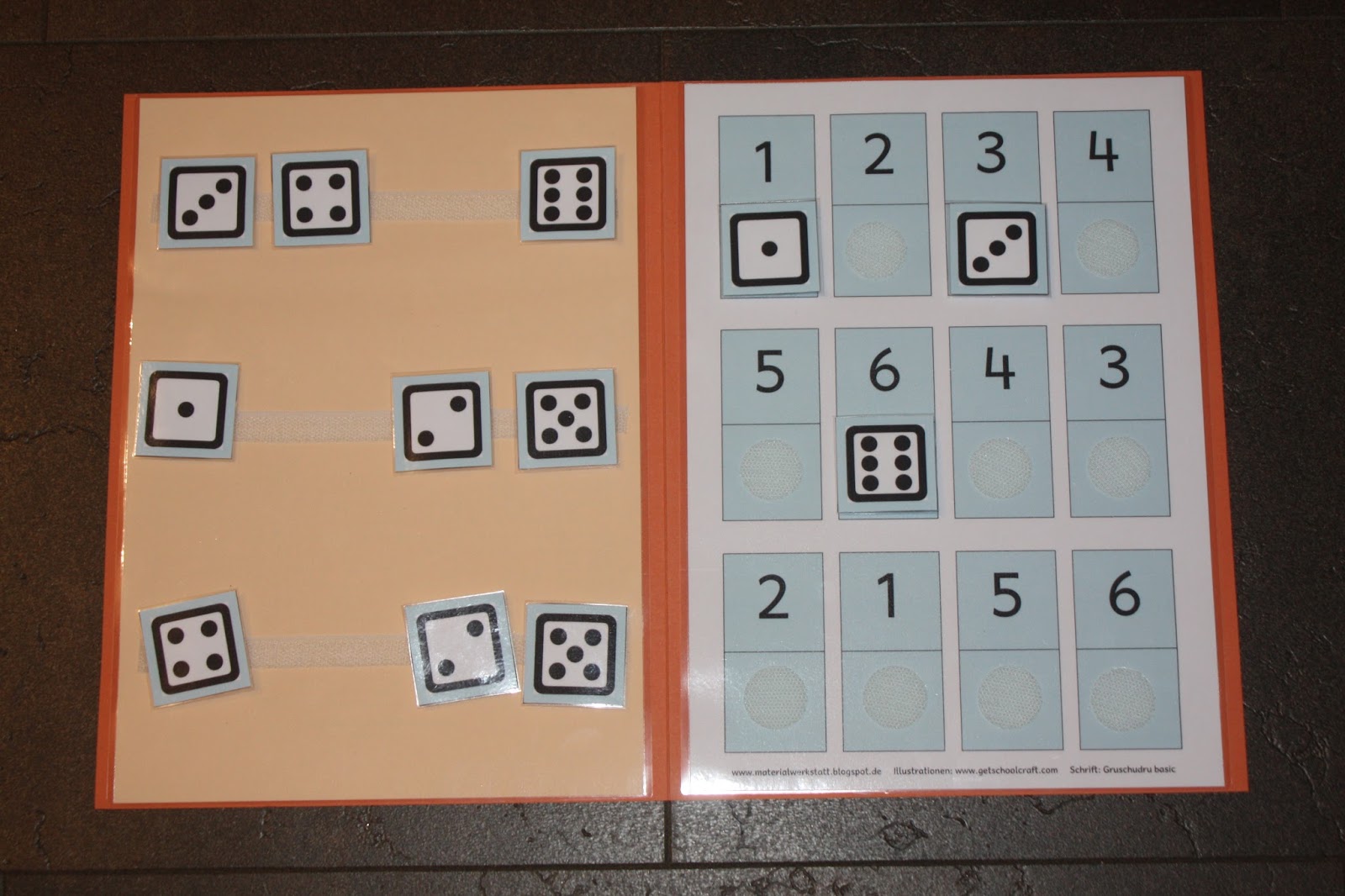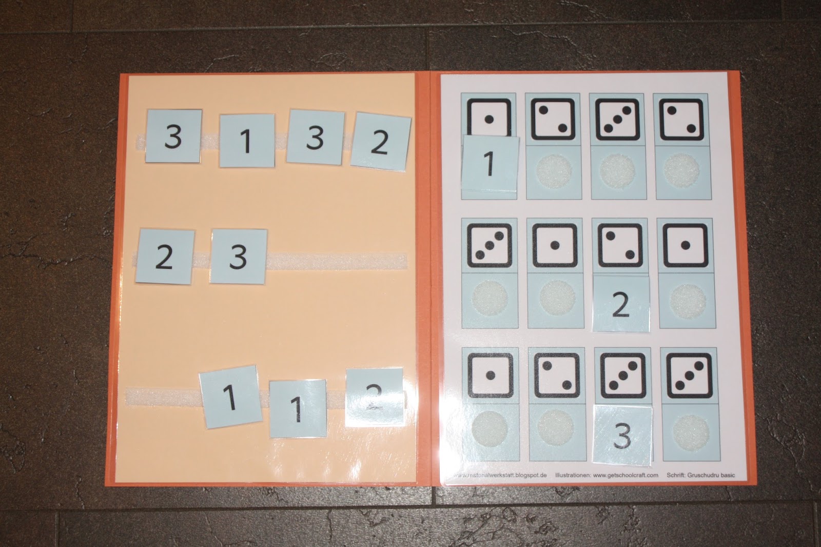 Ich habe 4 weitere strukturierte Arbeitsmappen erstellt. Wie immer sollen Bildteile von der einen Seite an die richtige Position auf der anderen Seite geklettet werden. Diesmal müssen Ziffern und Würfelbilder im Zahlenraum bis 3 bzw. bis 6 passend zugeordnet werden.